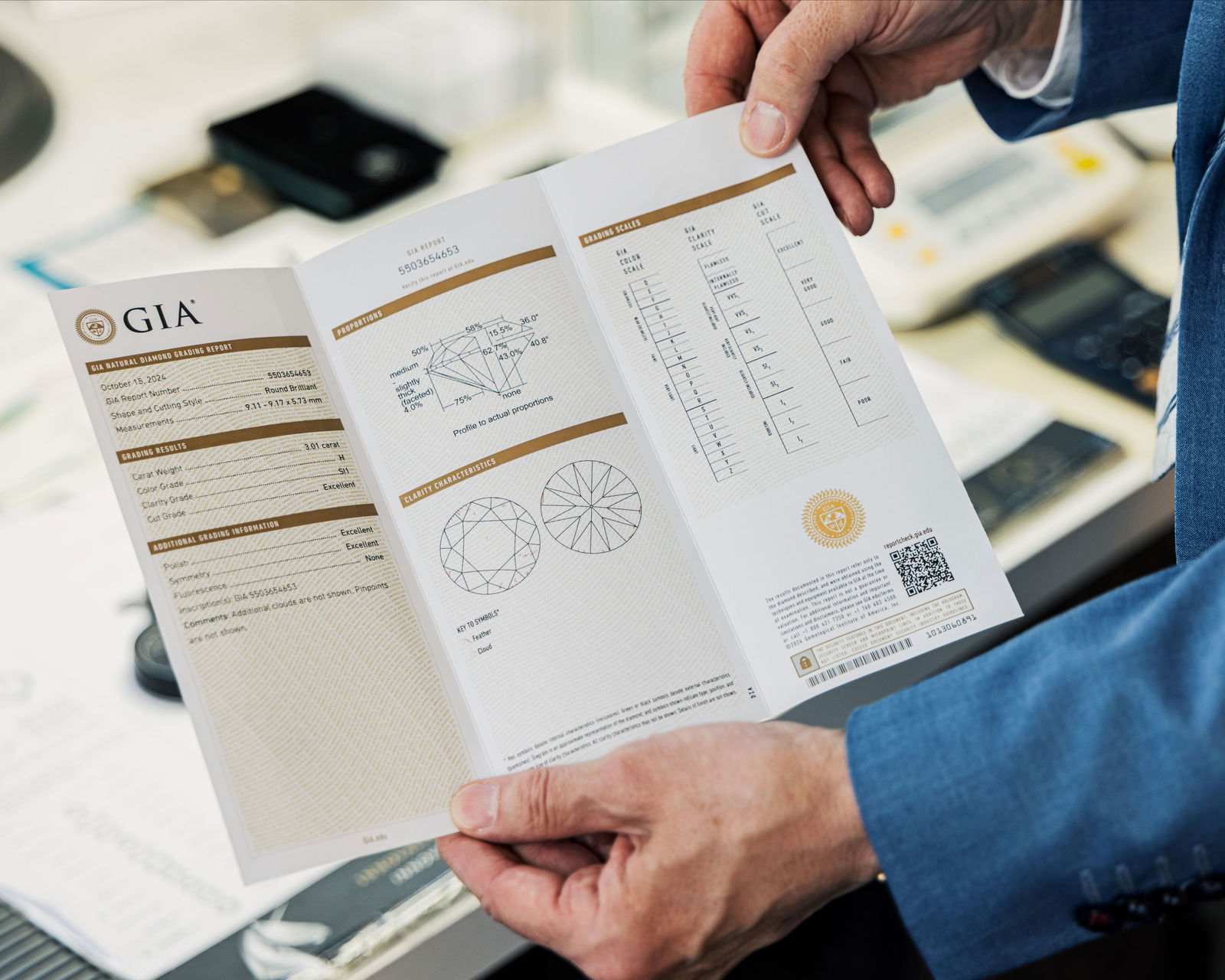 Wir verwenden ausschließlich Diamanten, die von den führenden internationalen Institutionen wie dem Gemmological Institute of America (GIA)geprüft wurden
