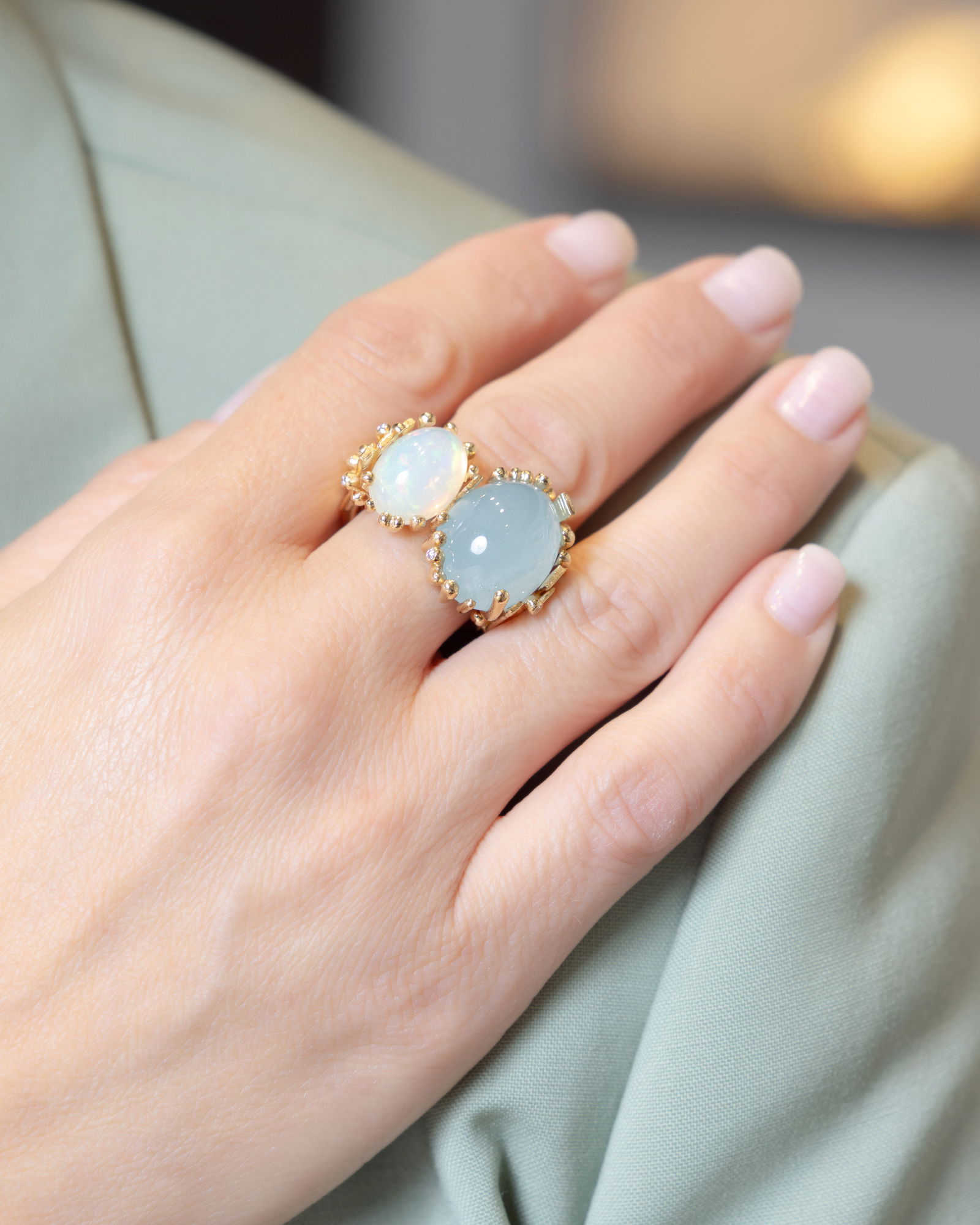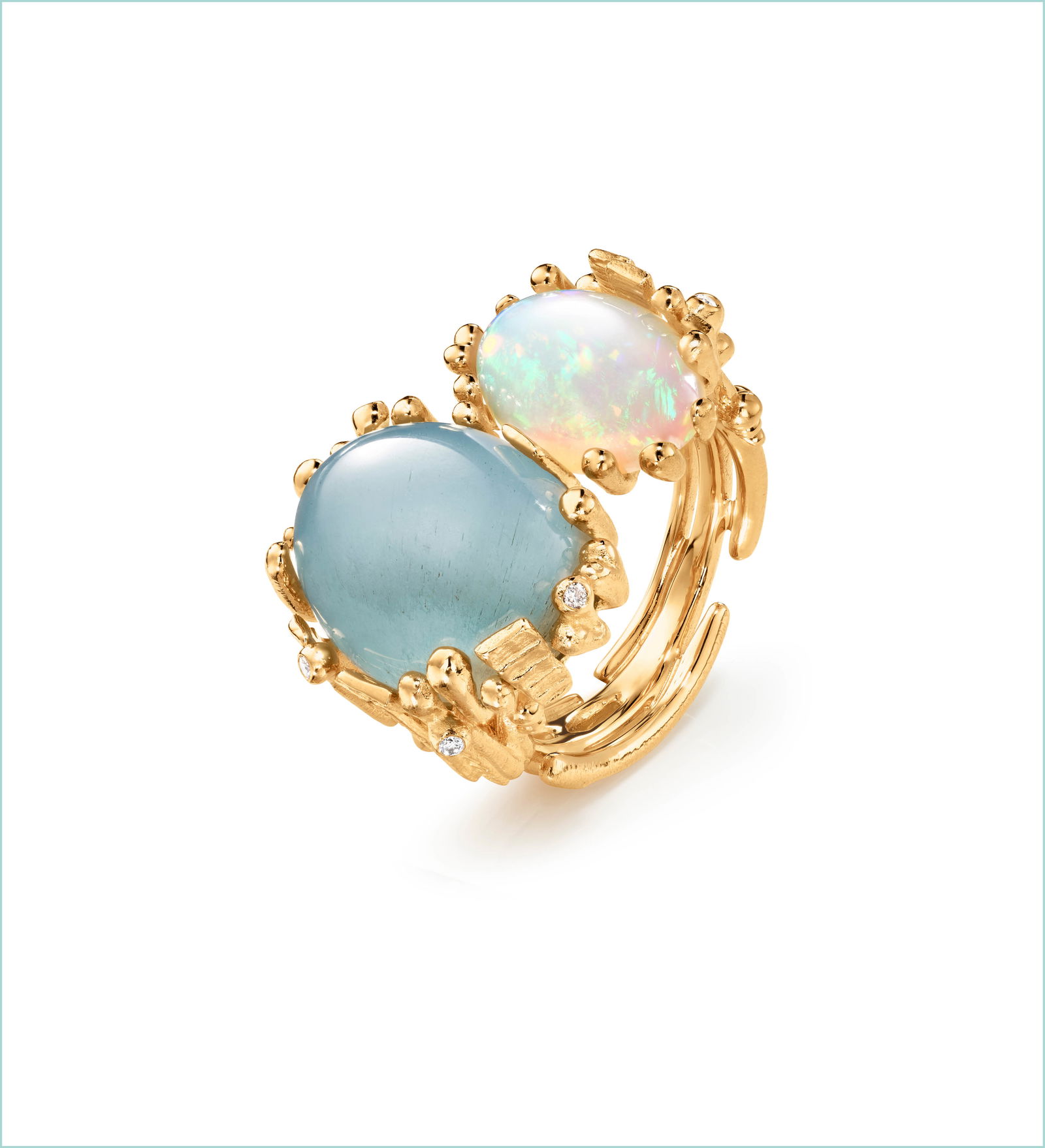 Der Boho-Ring von Ole Lynggaard vereint 18 Karat Gelbgold mit einem leuchtenden Mix aus Aquamarin, Opal und Diamanten. Alle Edelsteine sind handverlesen und in fein modellierte Fassungen gesetzt – ein Kunstwerk, das zugleich verspielt, luxuriös und individuell ist.