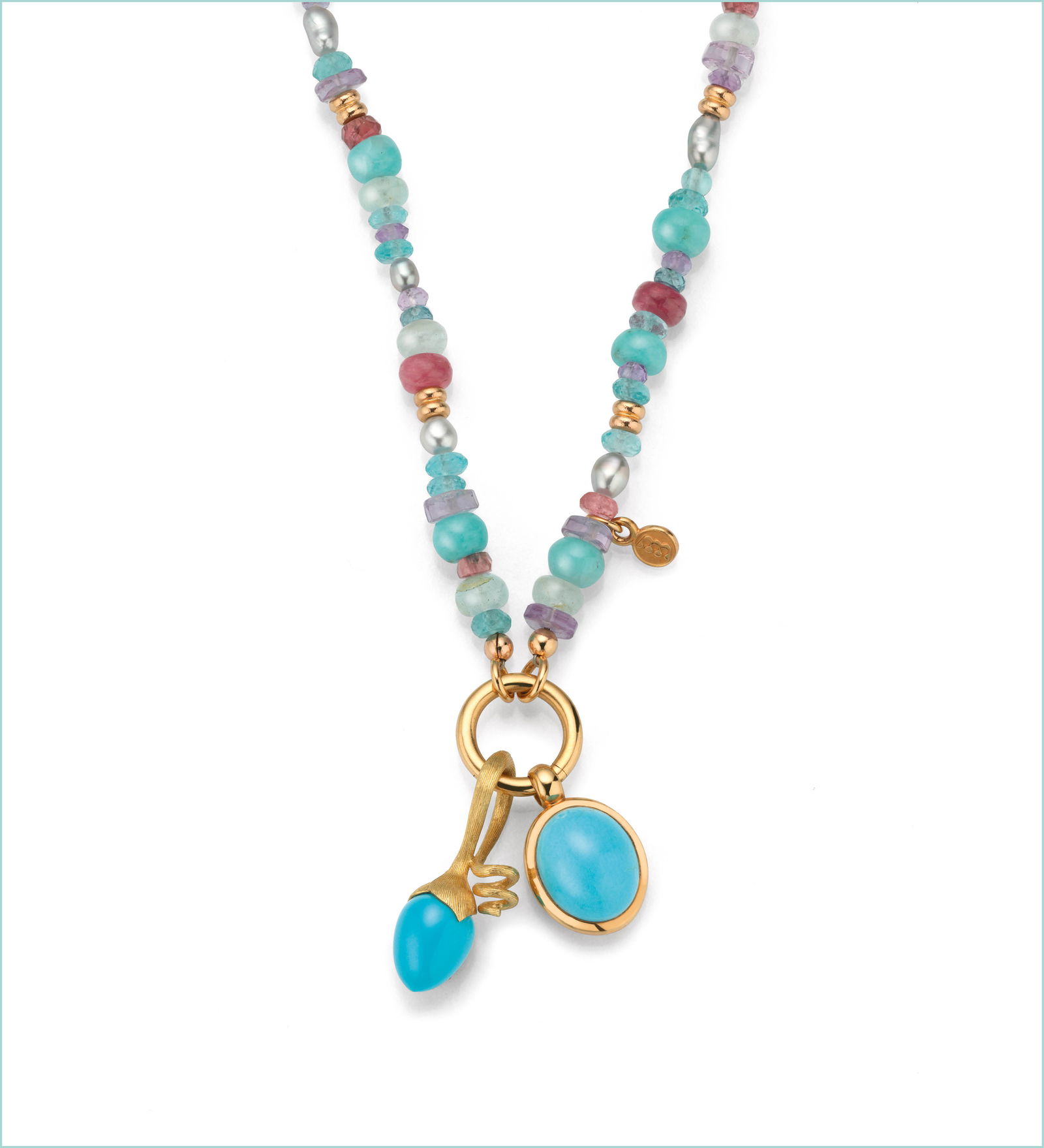 Bron Collier 750/- Roségold, Amazonite, Amethyste, Turmaline, Aquamarine, Keshi-Perlen. 3.250 EUR