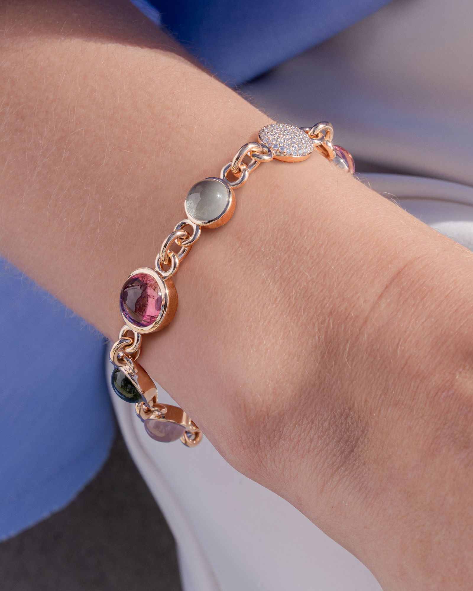 Bron Armband „Sushi“ 750/- Roségold, Diamanten 0,45 ct., Turmaline, Rosenquarz, Lemonquarze, Saphir. 23.500 EUR