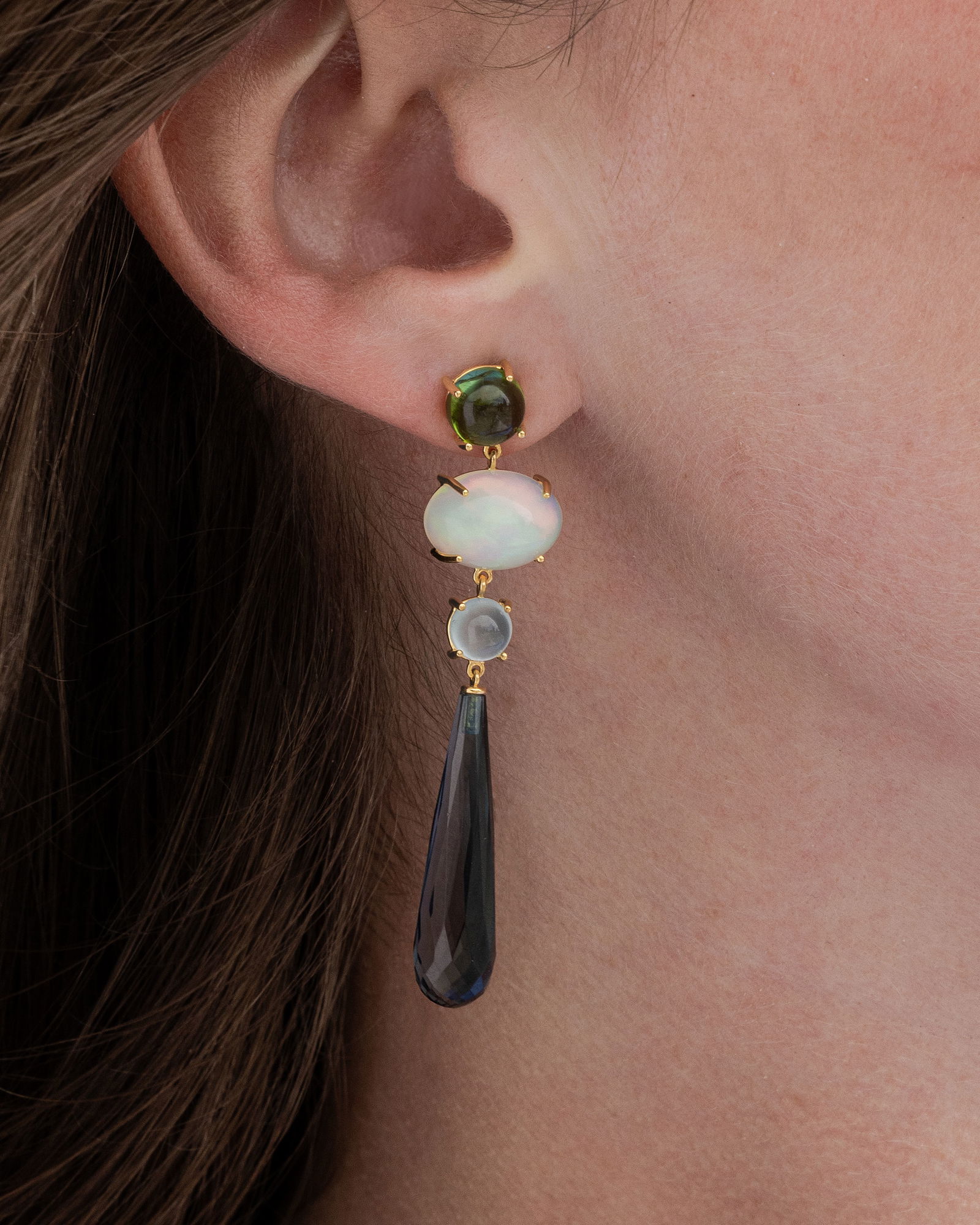 Ole Lynggaard Ohrringe „Lotus“ 750/- Gelbgold, Turmaline, Opale, Aquamarine, London Blautopase. 12.500 EUR