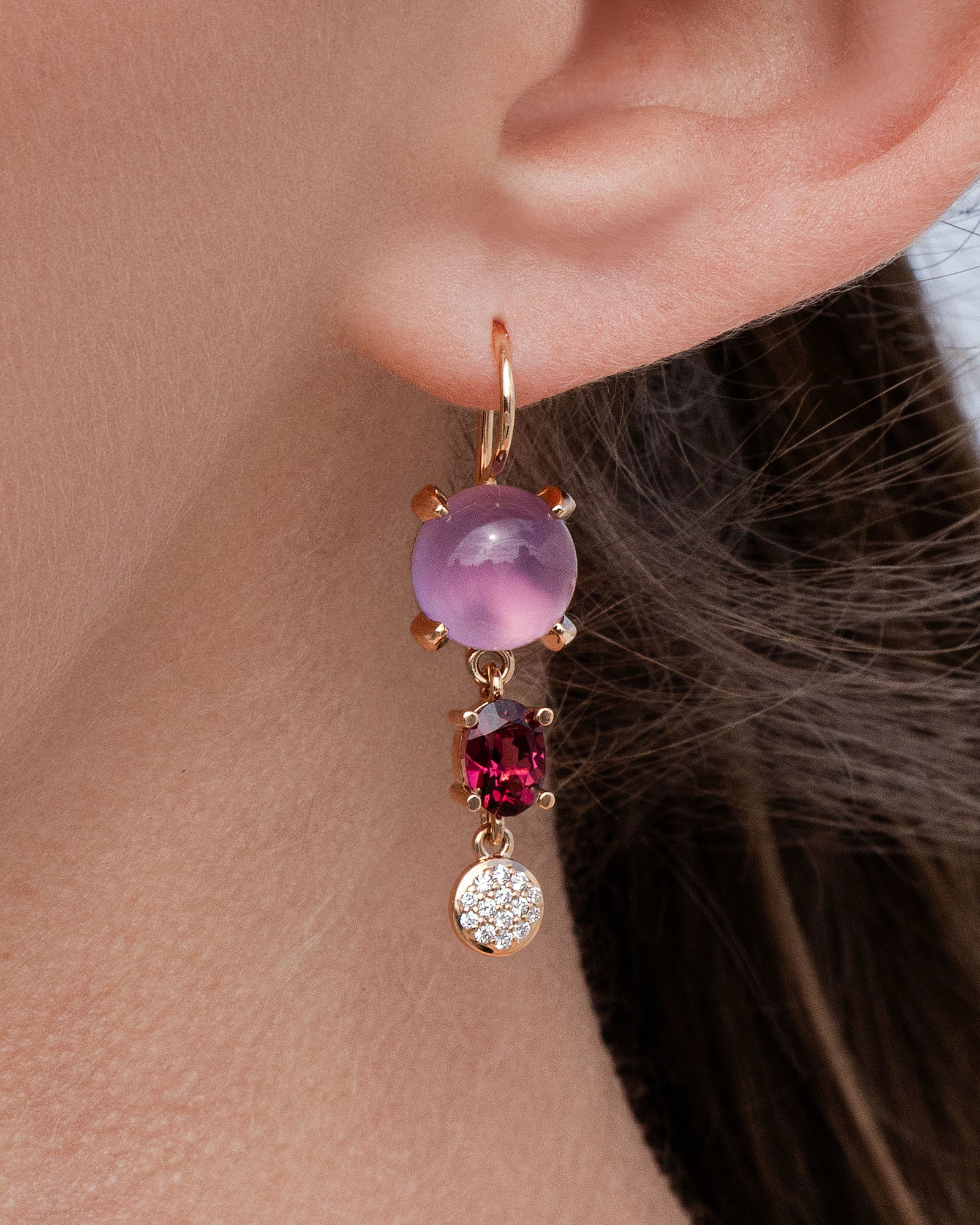 Bron Ohrhänger „Catch“ 750/- Roségold, Diamanten 0,20 ct., Amethyste, Rhodolithe. 7.500 EUR
