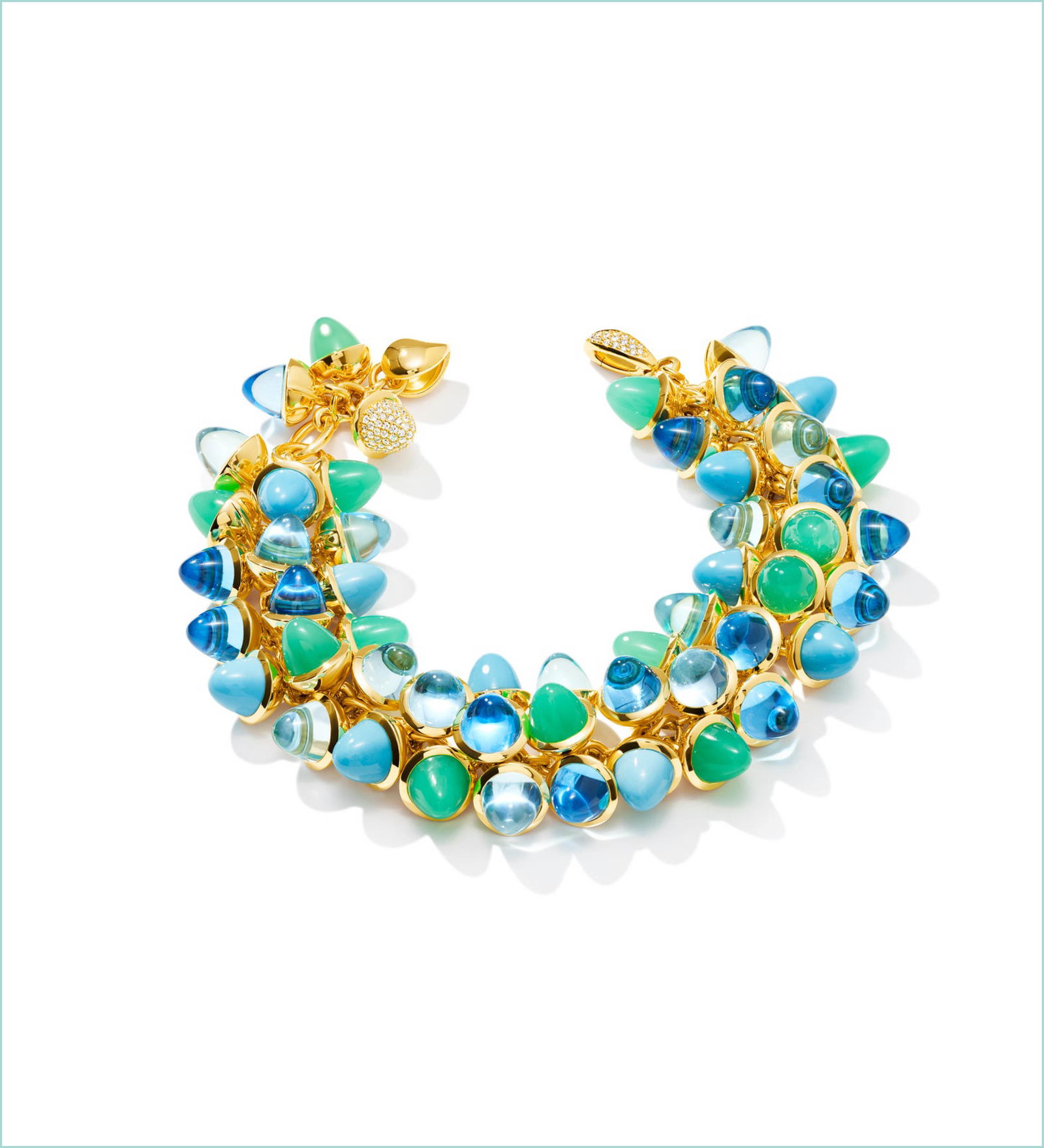 Tamara Comolli Armband „Mikado Flamenco Lagoon“ 750/- Gelbgold, Diamantpavés, Chrysoprase, Sky Topase, Swiss Topase, Türkise. 56.000 EUR