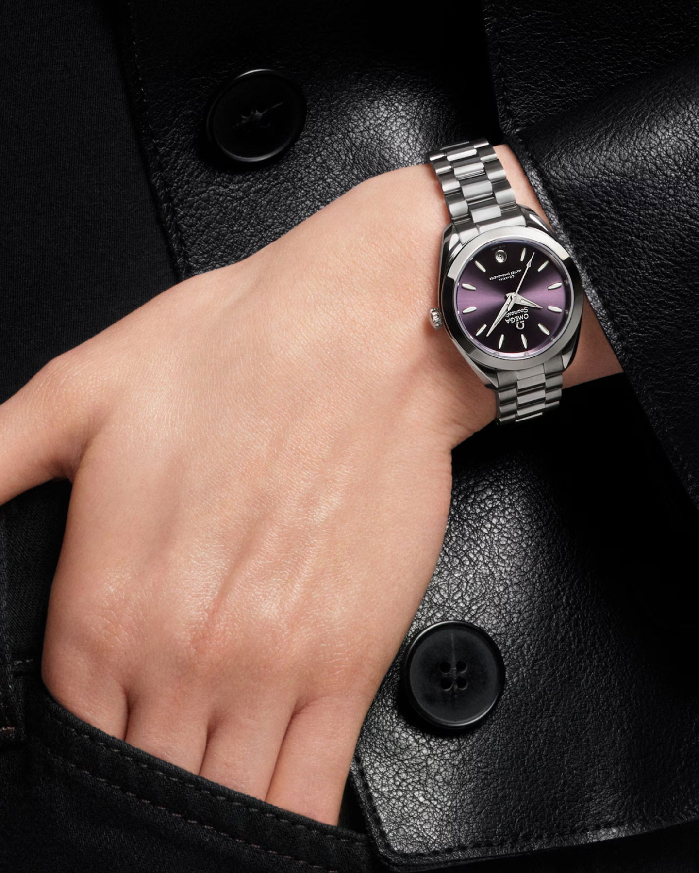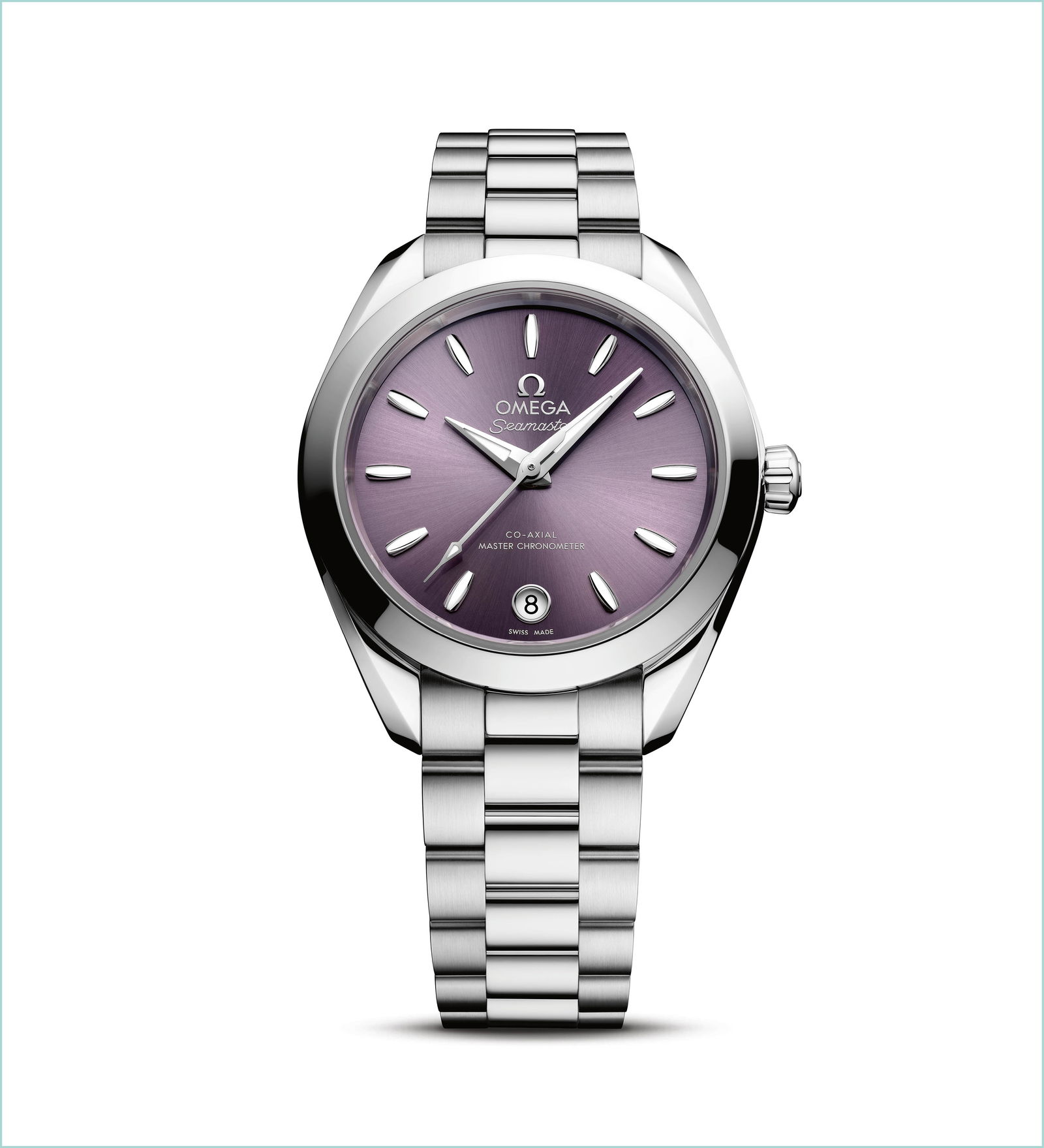 Die Seamaster Aqua Terra vereint Eleganz und maritime Tradition: schlankes 30-mm-Edelstahlgehäuse, lavendelfarbenes Zifferblatt, leuchtende Weißgold-Zeiger und feine Details. Präzises Master Chronometer Kaliber und luxuriöses Armband machen sie zu einem zeitlosen, stilvollen Statement.
