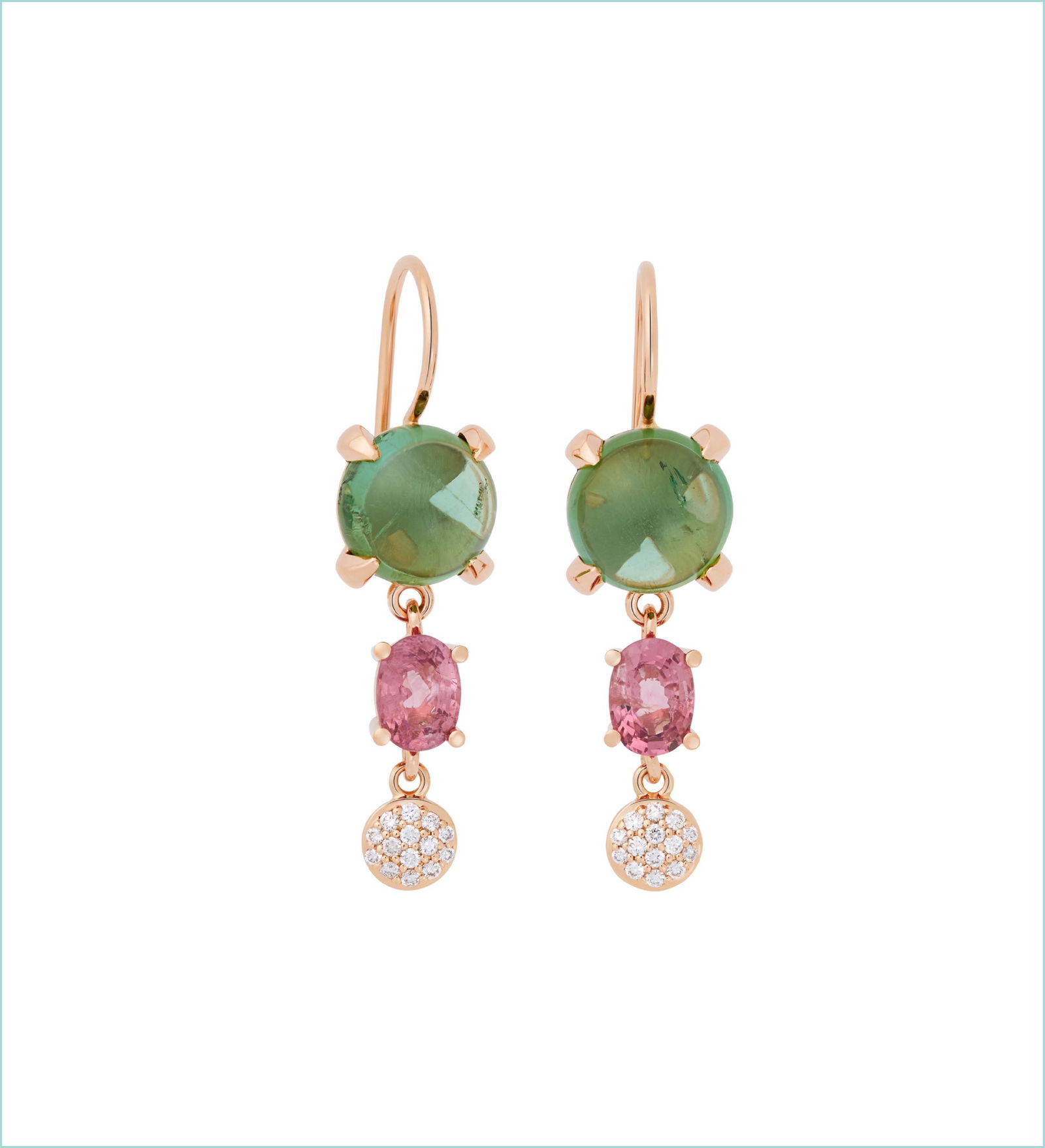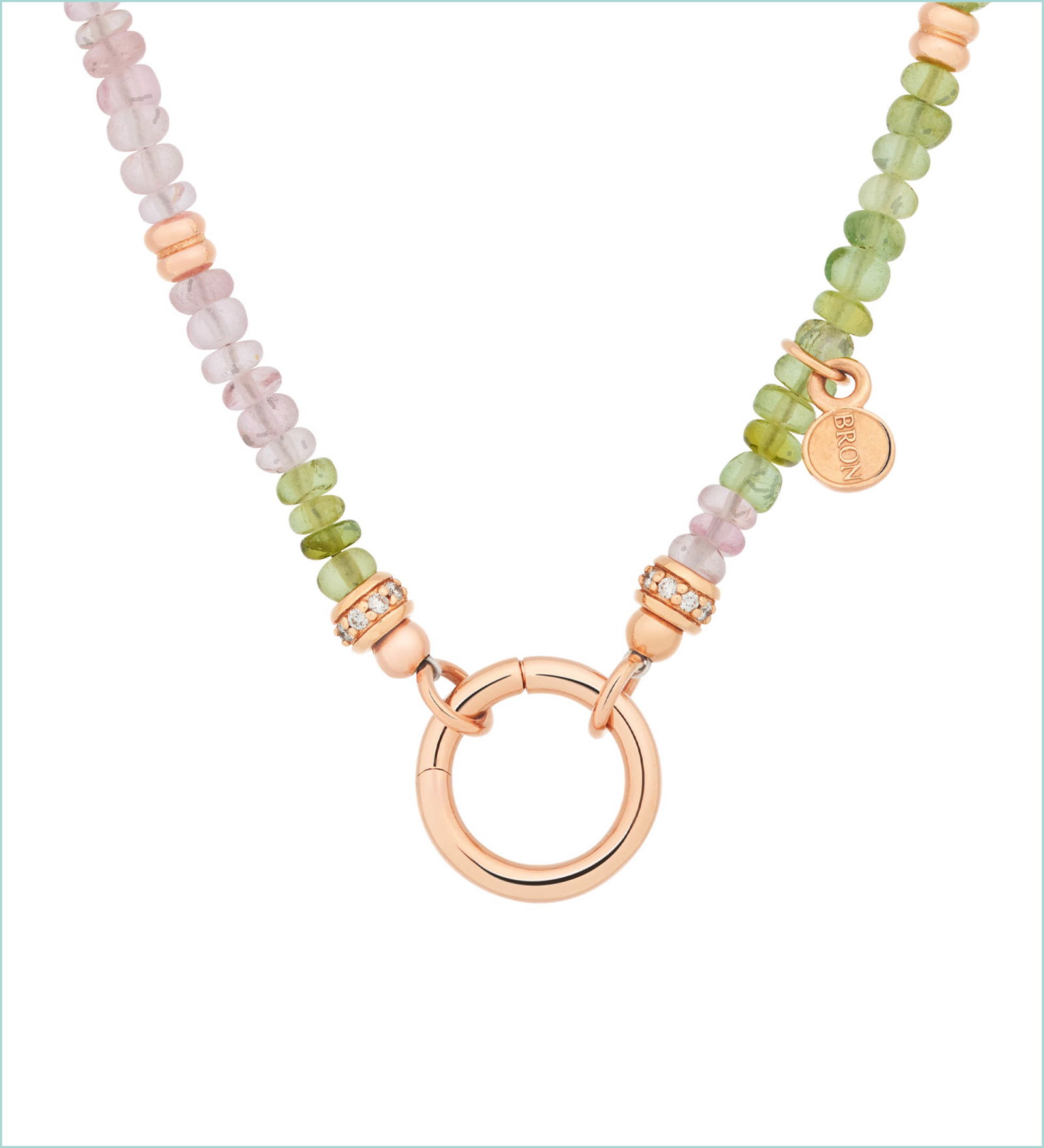 Bron Anhänger „Mira Mira“ und Kette 750/- Roségold, Rosenquarze, Turmaline, Diamanten. 6.650 EUR.