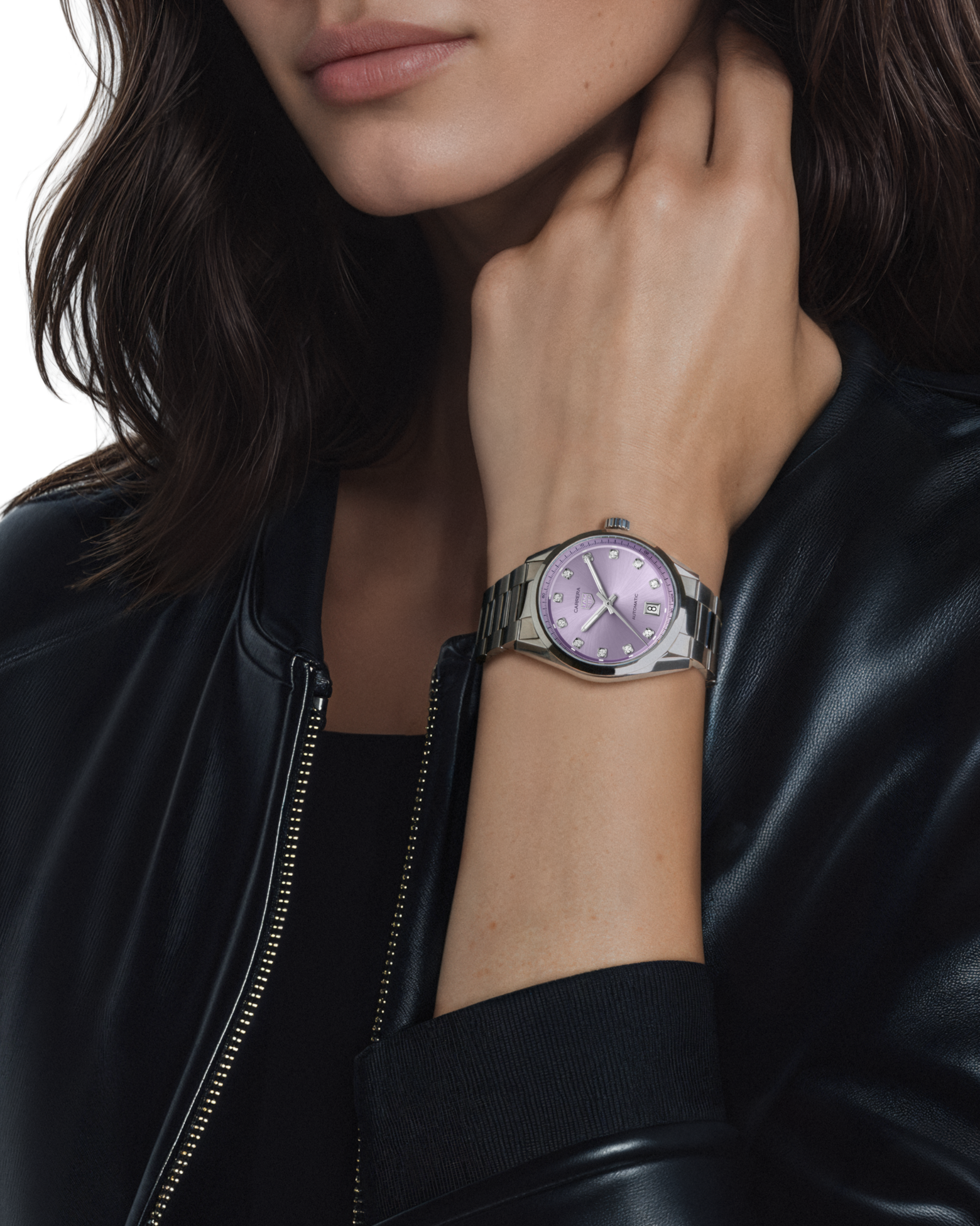 Das fliederfarbene azurierte Zifferblatt setzt einen dynamischen Akzent, der durch eine um das Zifferblatt verlaufende Minuterie mit Farbverlauf hervorgehoben wird. Die diamantbesetzten Indizes unterstreichen den raffinierten Look und bringen zeitlosen Stil in den Vordergrund.