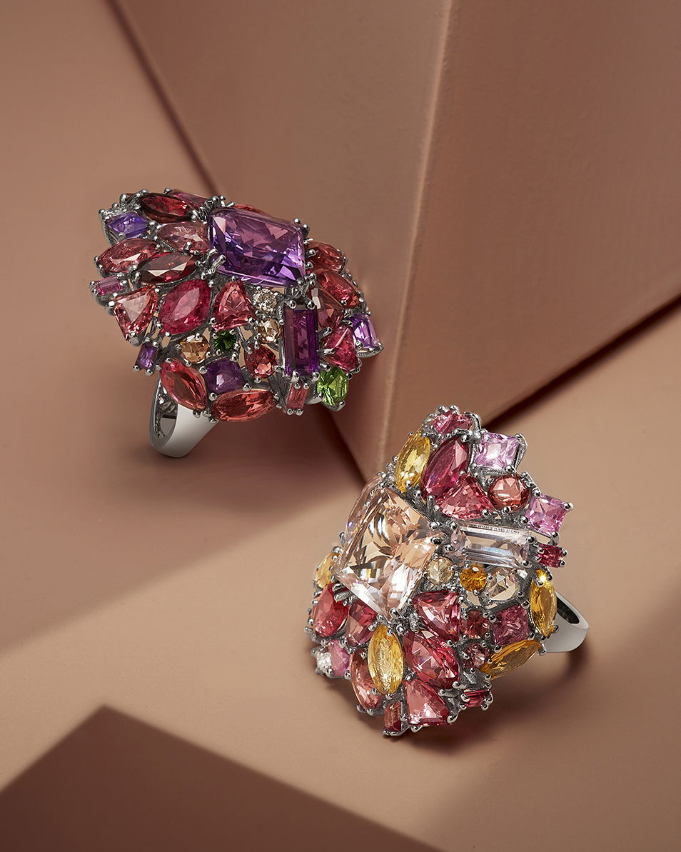 Grimaldo Firenze Ring „Chandelier“ 750/- Weißgold, Morganit, Saphire, Turmalin, Rubine, weiße und braune Diamanten. Preis auf Anfrage